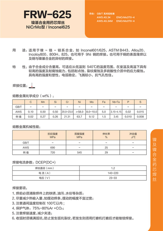 ENiCrMo3T0-4:适用于镍-铬-钼系合金,如Inconel601/625、ASTM B443、Alloy20、Incoloy800、800H、825、也可用于9Ni钢的焊接。也可用于钢的表面堆焊以及钢与镍基合金的异材的焊接。