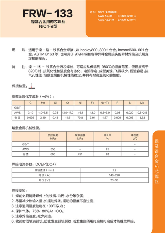 ENiCrFe2T0-4:适用于镍-铬-铁系合金焊接,如Incoloy800、800H合金,Inconel600、601合金,ASTM B163等,也可用于9%Ni钢和各种异种金属接头的异材焊接及抗蠕变焊接的接头