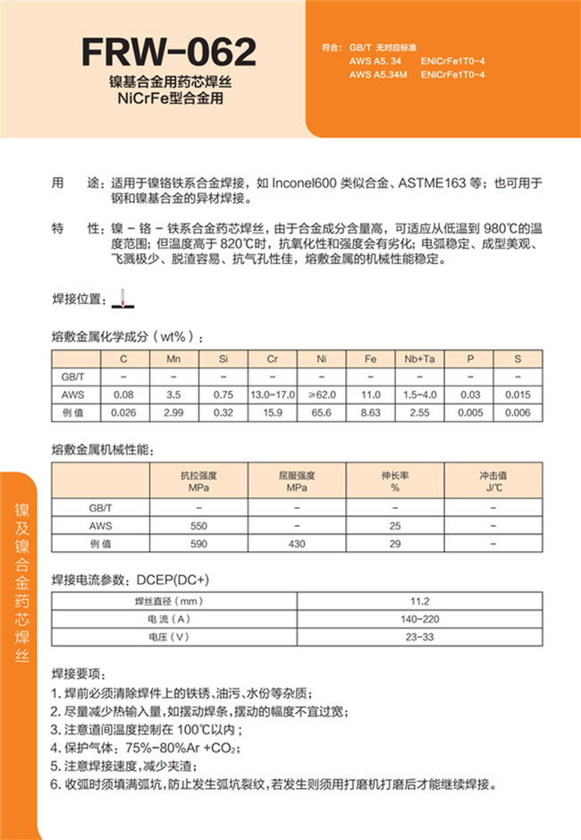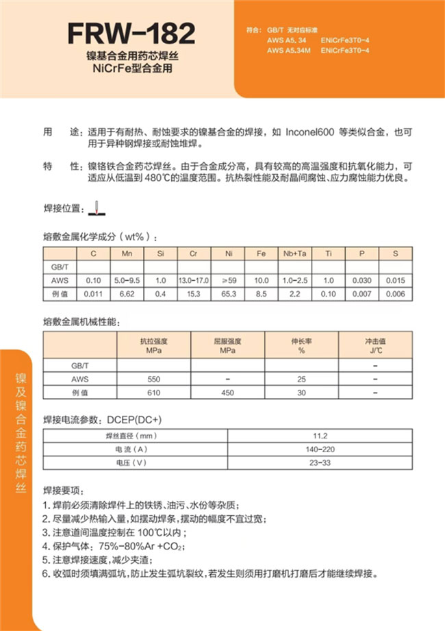 ENiCrFe3T0-4:适用于有耐热、耐蚀要求的镍基合金的焊接,如Inconel600等类似合金,也可用于异种钢焊接或耐蚀堆焊。