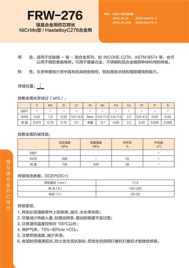 ENiCrMo4T0-4:适用于低碳镍-铬-钼合金系列,如INCONE C276、ASTM B574等,也可以用于钢的表面堆焊。可用于镍基合金、不锈钢和低合金钢异种材料间的焊接。