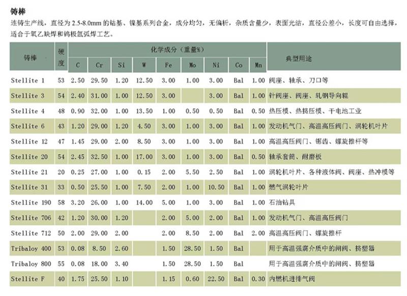用途:用于高温高压、内燃机阀、化纤剪刀刃口、高压泵的轴套筒和内衬套筒、木材锯齿、热轧精轨型辊等的堆焊。