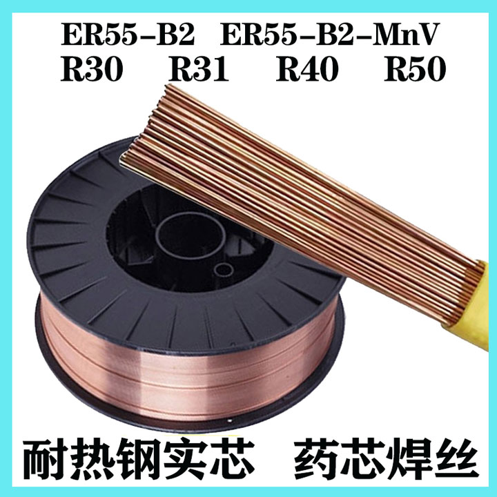 R31耐热钢实芯焊丝/ER55-B2-MnV:适用于工作在550℃以下的锅炉受热面管和工作在520℃以下的电站水冷壁、蒸气管道、高压容器等,如12CrMoV管板的焊接。
