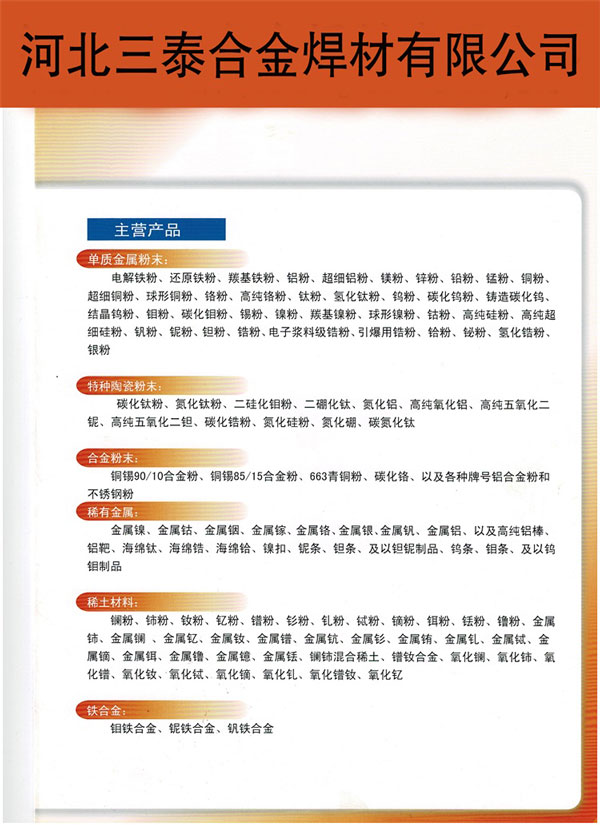 产品简介:钴粉 铬粉 银粉 铌粉 钼粉 铜粉 钨粉 铁粉 铅粉 钽粉 镍粉 锡粉